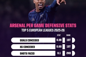 數(shù)據(jù)統(tǒng)計顯示,阿森納本賽季5項(xiàng)防守端關(guān)鍵數(shù)據(jù)均位列英超前二: