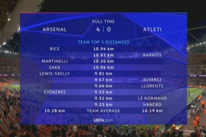 賽后兩隊跑動數據顯示,阿森納全隊平均跑動距離為10.28KM略高于馬競的10.19KM。但是,在跑動距離超過10KM的球員中,阿森納有3人,分別為賴斯(全場最高10.94KM)、馬丁內利和薩卡,而馬競僅有1人為巴里奧斯。
