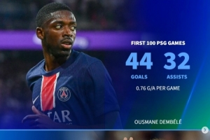 體育資訊10月22日訊 在本輪歐冠巴黎7-2擊敗勒沃庫森的比賽中,登貝萊迎來巴黎生涯100場里程碑,德轉也對比了登貝萊與內馬爾、伊布、姆巴佩等人在巴黎前100場參與進球數據: