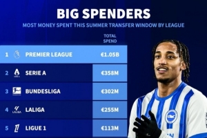 體育資訊7月2日訊 若昂-佩德羅已經官宣加盟切爾西,《轉會市場》也列出了今夏各大聯賽轉會費支出情況,英超無懸念斷崖領跑。