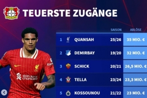 體育資訊7月3日訊 利物浦中衛(wèi)寬薩已經(jīng)官宣轉(zhuǎn)會(huì)勒沃庫(kù)森,《轉(zhuǎn)會(huì)市場(chǎng)》統(tǒng)計(jì)顯示他也是藥廠隊(duì)史標(biāo)王。