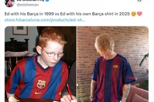 體育資訊10月24日訊 英國(guó)創(chuàng)作歌手艾德-希蘭更新社媒,曬出自己在1999年和2025年身穿巴薩球衣的照片。