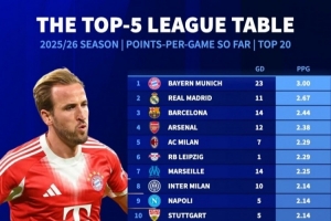 本賽季五大聯賽場均拿分榜(及凈勝球數):