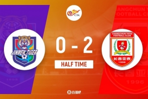 傷停補時4分鐘。上半場比賽結束,天津津門虎0-2長春亞泰。