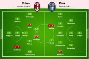 體育資訊10月25日訊 AC米蘭2-2絕平比薩,賽后米體對米蘭將帥的表現進行了打分。