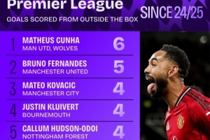 體育資訊10月26日訊 曼聯在本輪英超4-2力克布萊頓,庫尼亞遠射建功。數據統計顯示他也是上賽季至今英超禁區外破門次數最多的球員。