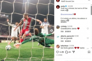 體育資訊10月26日訊 瓦爾迪今天在Instagram發文,慶祝自己打入克雷莫內塞生涯首球。