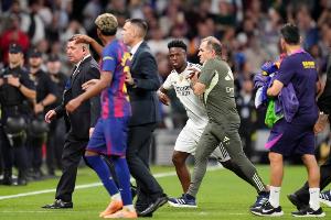 亞馬爾走近場邊時,維尼修斯走過來對他做了“話太多”的手勢,兩人發生爭吵。皇馬門將教練略比斯試圖將維尼修斯拖回球員通道,但這位巴西人開始沖向亞馬爾,被皇馬四名工作人員攔住。拉菲尼亞跑向國家隊隊友維尼修斯,被皇馬的巴爾韋德及時制止。