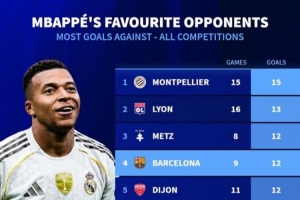 體育資訊10月27日訊 皇馬在本輪西甲焦點戰(zhàn)2-1力克巴薩,姆巴佩取得進球。《轉會市場》統(tǒng)計顯示,巴薩也是姆巴佩生涯各項賽事進球第4多的對手。