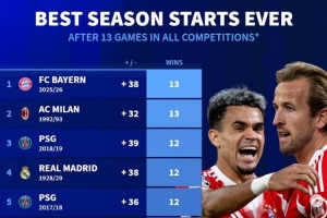 體育資訊10月27日訊 拜仁在本輪德甲焦點戰(zhàn)3-0完勝門興,延續(xù)了賽季開局全勝戰(zhàn)績,也追平米蘭的五大聯(lián)賽球隊單賽季各項賽事開局連勝紀(jì)錄。《轉(zhuǎn)會市場》也統(tǒng)計了五大聯(lián)賽球隊歷史的單賽季各項賽事前13場比賽的勝場情況。