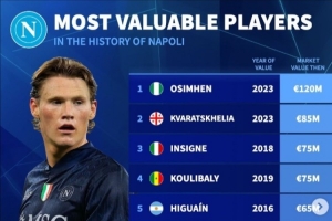 體育資訊10月28日訊 德國轉會市場統計了那不勒斯隊史的身價前10球員,奧斯梅恩位列第一。