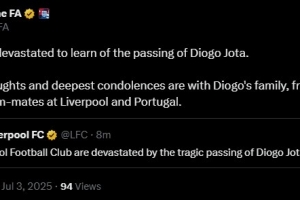 英足總寫道:“驚悉迪奧戈-若塔離世,我們深感悲痛。謹向迪奧戈的家人、朋友,以及他在利物浦俱樂部和葡萄牙國家隊的隊友致以最深切的哀悼。”