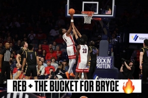 詹姆斯轉發了亞利桑那大學男籃官方賬號發布的他的小兒子布萊斯在比賽中完成補籃的照片,并配文道:“耶——6號!”