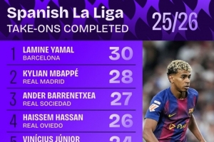 體育資訊10月29日訊 Squawka統計了本賽季球員在西甲的成功過人次數,并列出榜單,亞馬爾、姆巴佩排名前兩位。