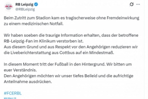 萊比錫俱樂部確認,一名萊比錫球迷進入球場時發生緊急醫療情況(與外部因素無關),被送往醫院,最終在醫院去世,萊比錫俱樂部社媒因此將這場比賽的直播報道減少到最低限度,并向家屬表示深切慰問。