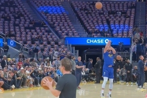 賽前熱身環節,勇士球星庫里在中圈出手,皮球精準入筐。