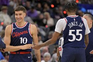 對此,快船記者Law Murray發推寫道:“在哈登、萊昂納德、祖巴茨身邊搭配博格丹/巴圖姆、瓊斯/鄧恩的8.5分鐘里,勇士占據絕對優勢,比分是27-14。之后快船換上了科林斯和大洛。”