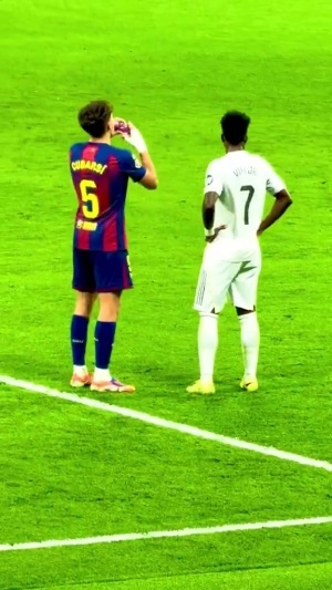 在比賽中,皇馬邊鋒維尼修斯從場邊拿了一瓶水走進場內,口渴的巴薩后衛庫巴西上前討水喝,巴西人沒有猶豫直接遞給了西班牙后衛。