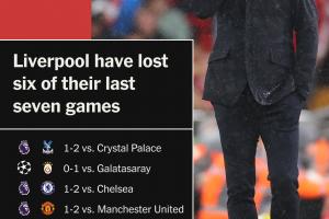 利物浦各項(xiàng)賽事近7場6敗,聯(lián)賽杯出局、止步16強(qiáng),英超落后榜首7分。上賽季的耐考王如今節(jié)節(jié)退敗。