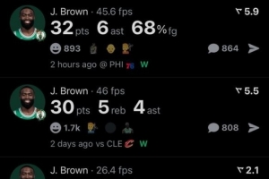 過去四場(chǎng)比賽,杰倫-布朗砍三場(chǎng)30+,其中一場(chǎng)40+,場(chǎng)均能夠轟下29.5分。