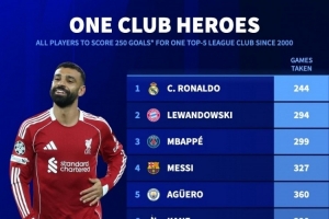 在單一球隊進250球所用場次:C羅244場、梅西327場、薩拉赫415場
