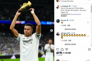 姆巴佩社媒曬出賽前展示歐洲金靴獎杯的照片,配文:“伯納烏的華彩之夜,全隊都表現出色,我們要繼續保持!Hala Madrid!”
