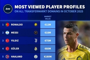 體育資訊11月2日訊 德國轉(zhuǎn)會(huì)市場列出了10月份球員頁面瀏覽量排名,C羅居首,梅西、伊爾迪茲二三位。