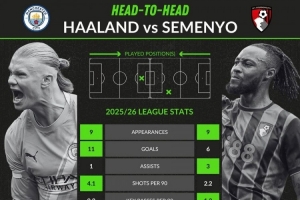 體育資訊11月3日訊 本輪英超,曼城將主場對陣伯恩茅斯。賽前WhoScored列出了兩隊主要得分手哈蘭德和塞梅尼奧的數據對比。