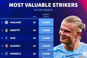 體育資訊11月3日訊 德轉列當前世界足壇中鋒身價排行,哈蘭德、姆巴佩1.8億歐并列最高,伊薩克1.4億歐,阿爾瓦雷斯、登貝萊1億歐。