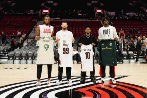 體育資訊11月4日訊 美職聯波特蘭伐木工隊球員大衛-達-科斯塔、維爾德在美職聯季后賽間隙到主場支持開拓者。球隊也由格蘭特、西索科做代表送出了定制球衣。